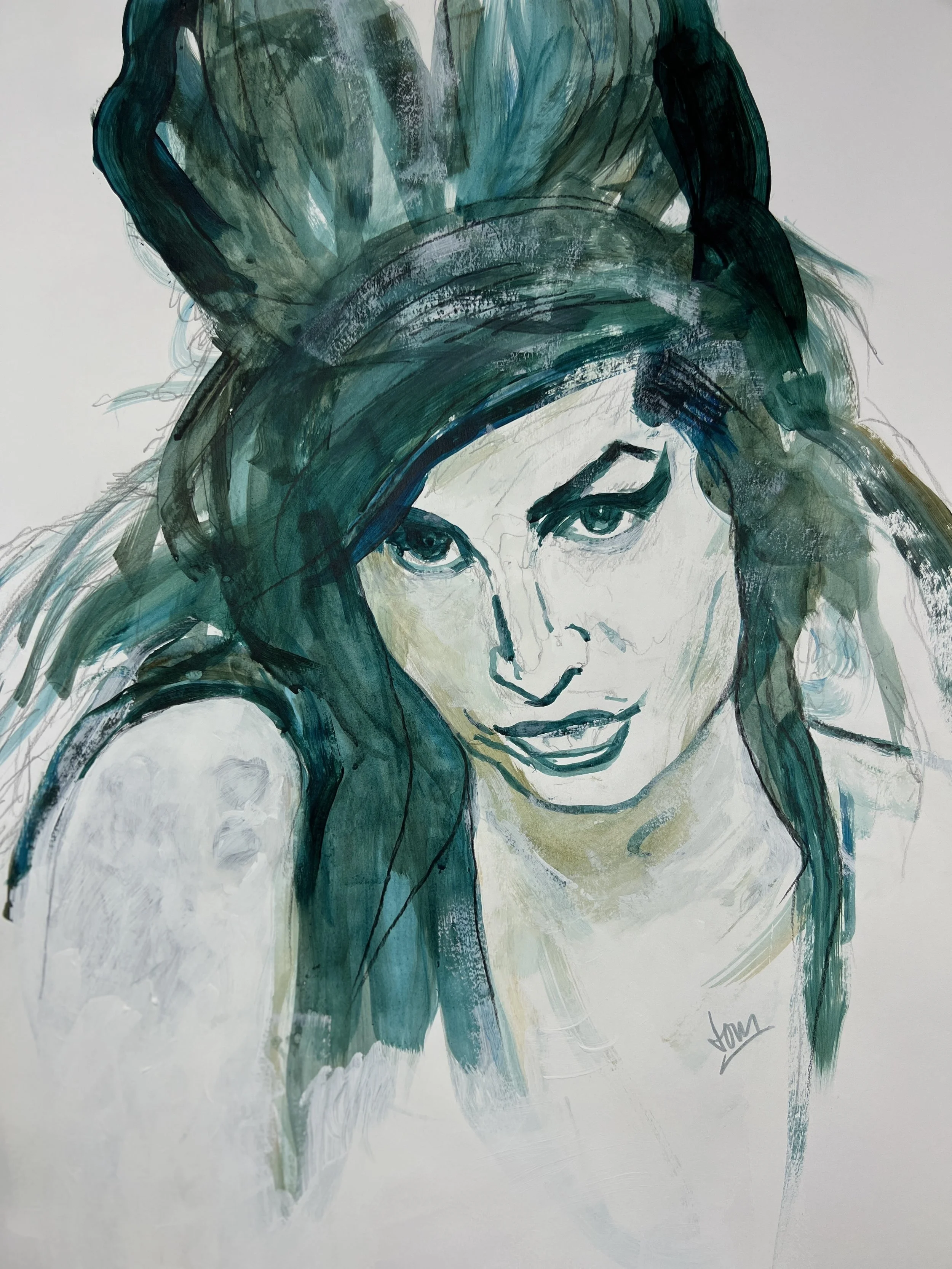 Wrapped in moody green-blue hues, this portrait is inspired by Amy Winehouse’s distinctive style and emotional depth.