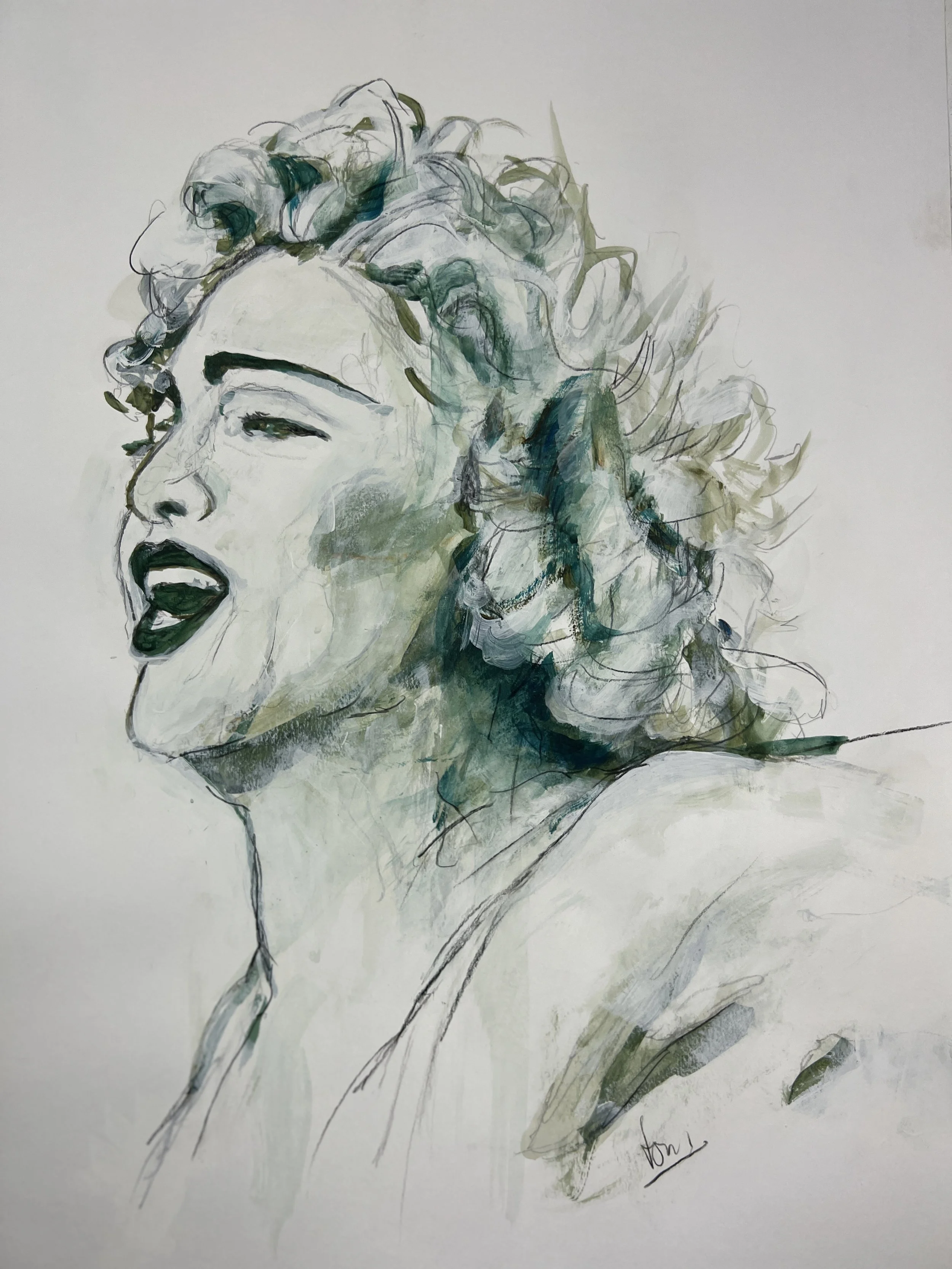 Bathed in strong blue-green tones, this work draws inspiration from Madonna’s fearless reinvention and striking presence.